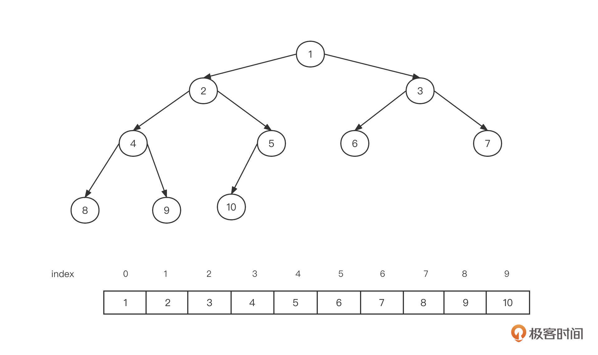 我们采用数组作为最小堆的底层数据结构,将最小堆用一棵二叉树来表示,这时的数据是按照从上到下、从左到右的方式依次存储在数组中的: