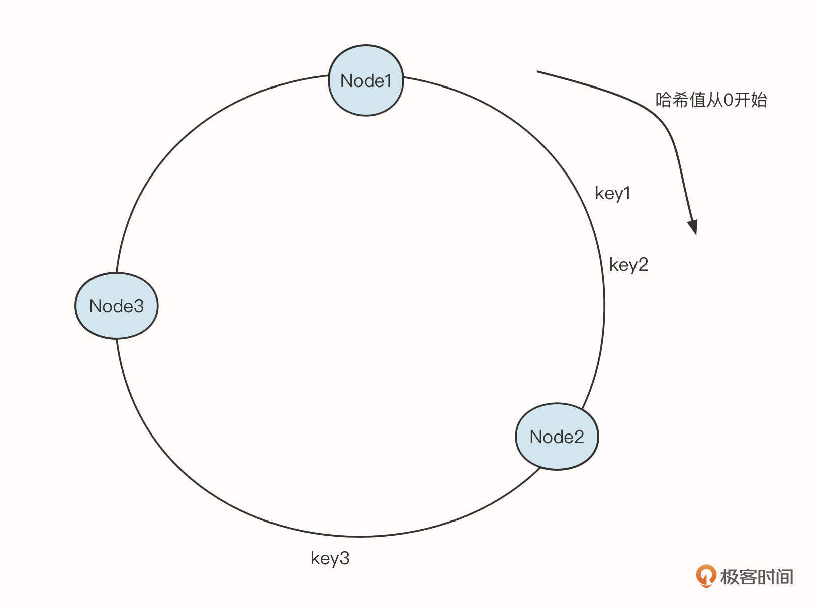其中,Node1、Node2、Node3是真实存储的有效数据,每一个节点需要存储一些关联信息,很适合key-value的存储形式。一致性哈希算法的查询规则是:查询第一个大于目标哈希值的节点。