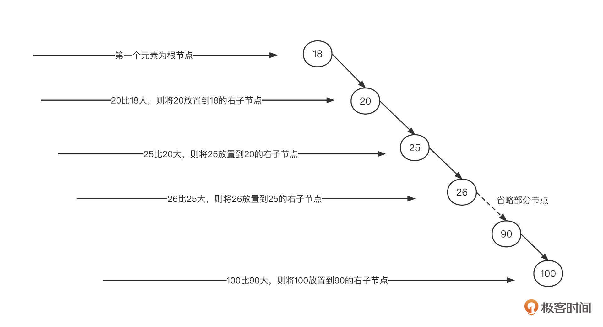 不过,二叉排序树也有缺陷。一个最主要的问题就是,在查找之前我们需要按照二叉排序树的存储特点来构建它。我们还是用上面这个例子,将节点按照从小到大的顺序构建二叉排序树,构建过程如下图所示: