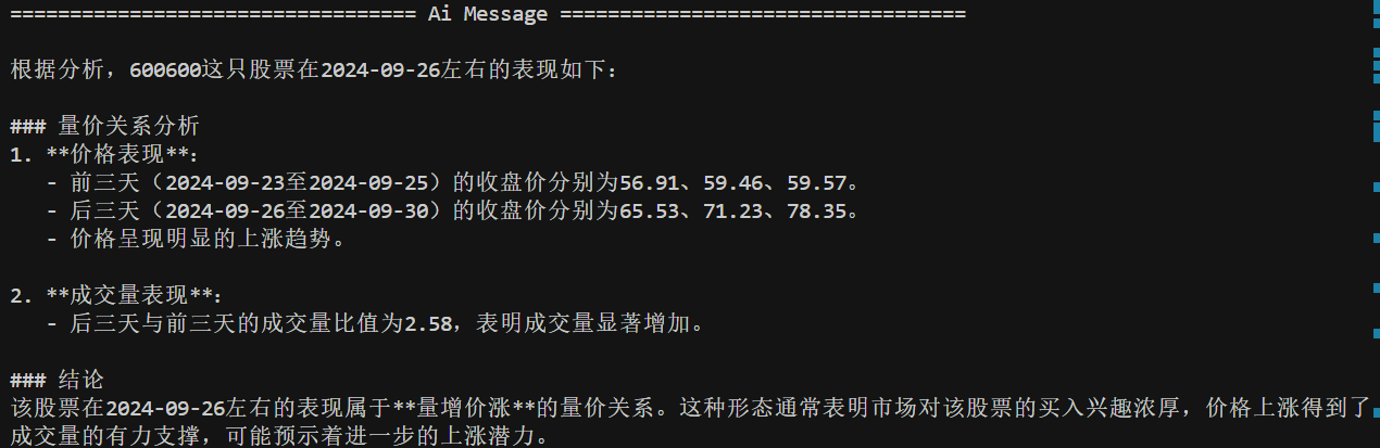 为了演示 DeepSeek 的量化分析能力,我在SystemMessage系统提示词中给出了明确的要求。让其用工具进行量能分析,同时还要求其明确告诉我们分析的股票表现属于量价关系的哪一种,这是为了与我们的课程内容相呼应。