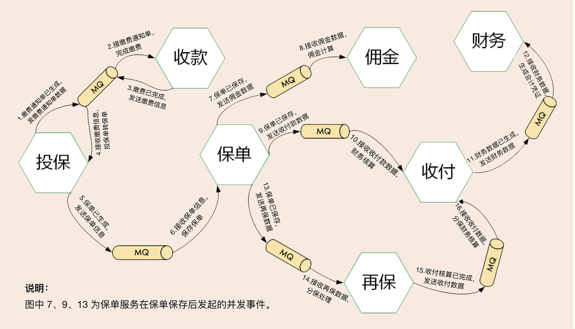 1.投保微服务生成缴费通知单,发布第一个事件:缴费通知单已生成,将缴费通知单数据发布到消息中间件。收款微服务订阅缴费通知单事件,完成缴费操作。缴费通知单已生成,领域事件结束。
