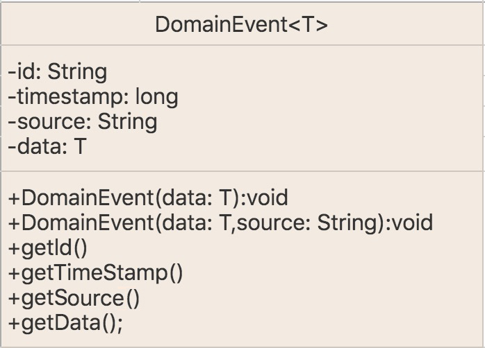 为了保证事件结构的统一,我们还会创建事件基类 DomainEvent(参考下图),子类可以扩充属性和方法。由于事件没有太多的业务行为,实现方法一般比较简单。