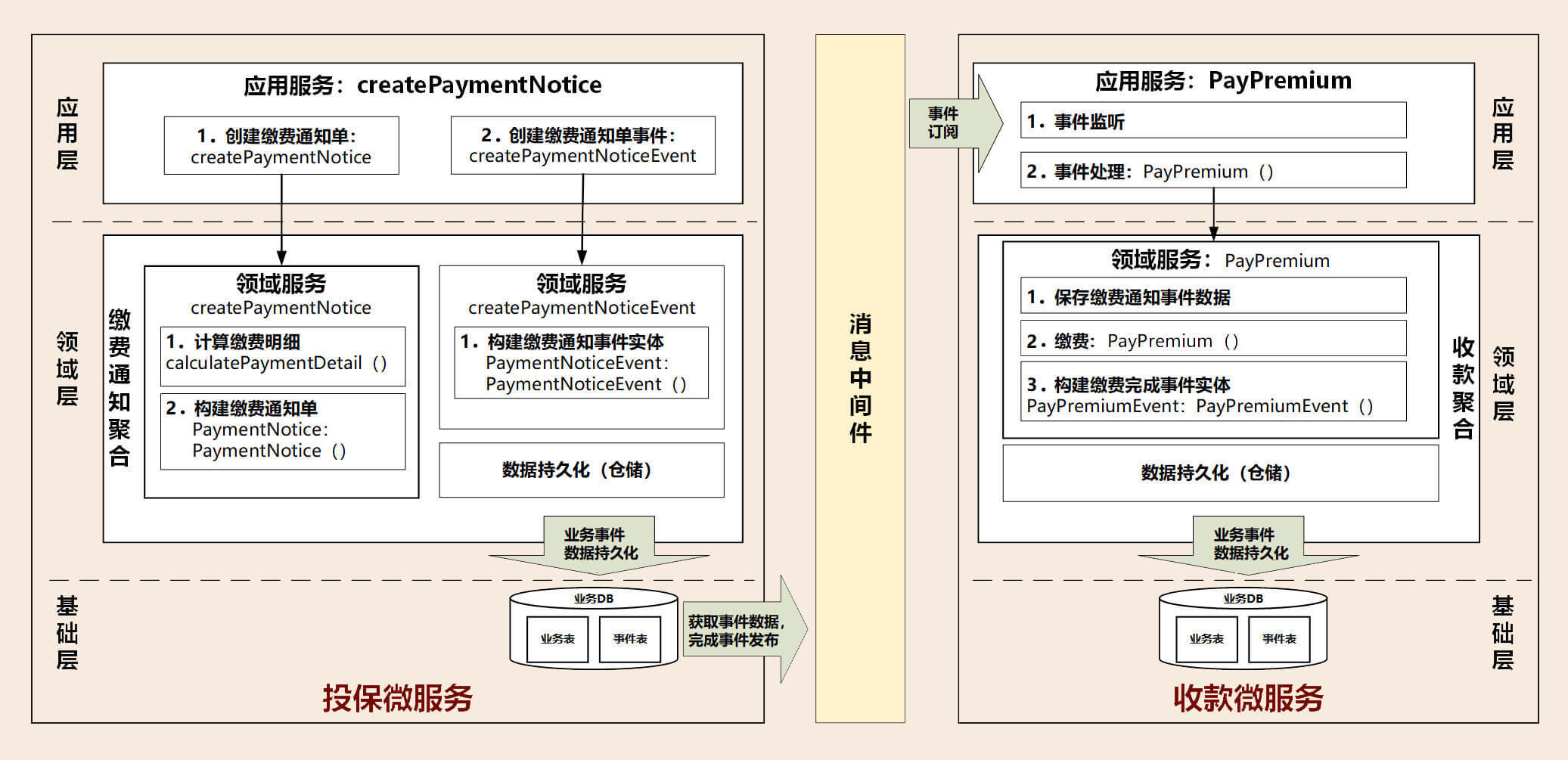 1.投保微服务应用服务,调用聚合中的领域服务createPaymentNotice和createPaymentNoticeEvent,分别创建缴费通知单、缴费通知单事件。其中缴费通知单事件类PaymentNoticeEvent继承基类DomainEvent。