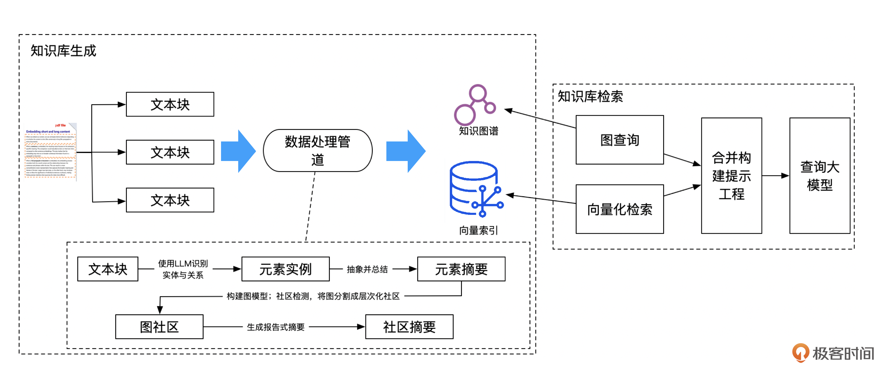这部分我们展开一下。如果你已经理解了RAG的原理,那么也应该能够发现RAG基于向量的近似邻近搜索有个缺点。那就是只能搜索出与问题关联密切的TopN个数据片段,无法跨文档,综合信息来回答。所以如果你需要检索一个全局性的或者总结性的问题,RAG表现就没那么好了。