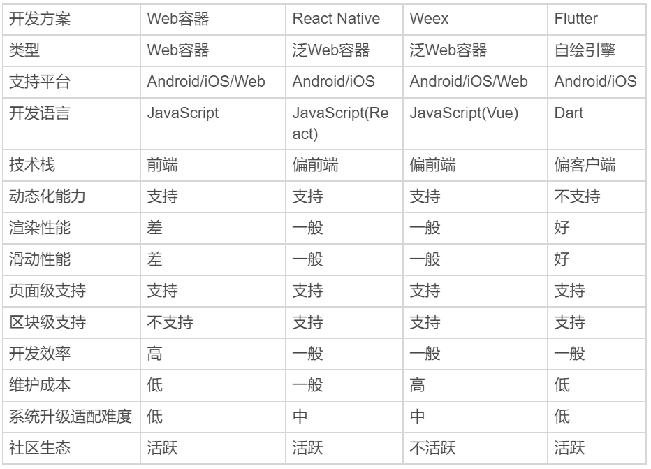 从不同的角度来看,三个时代的跨平台框架代表们在开发效率、渲染性能、维护成本和社区生态上各有优劣,如下图所示:
