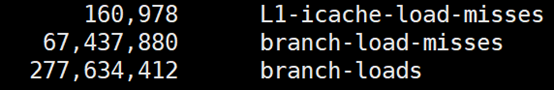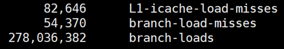 究竟有多高呢?我们还是用Linux上的perf来做个验证。使用 -e选项指明branch-loads事件和branch-load-misses事件,它们分别表示分支预测的次数,以及预测失败的次数。通过L1-icache-load-misses也能查看到一级缓存中指令的未命中情况。