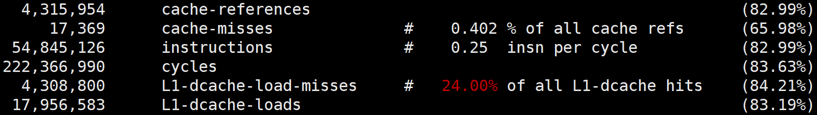 执行perf stat可以统计出进程运行时的系统信息(通过-e选项指定要统计的事件,如果要查看三级缓存总的命中率,可以指定缓存未命中cache-misses事件,以及读取缓存次数cache-references事件,两者相除就是缓存的未命中率,用1相减就是命中率。类似的,通过L1-dcache-load-misses和L1-dcache-loads可以得到L1缓存的命中率),此时你会发现array[i][j]的缓存命中率远高于array[j][i]。