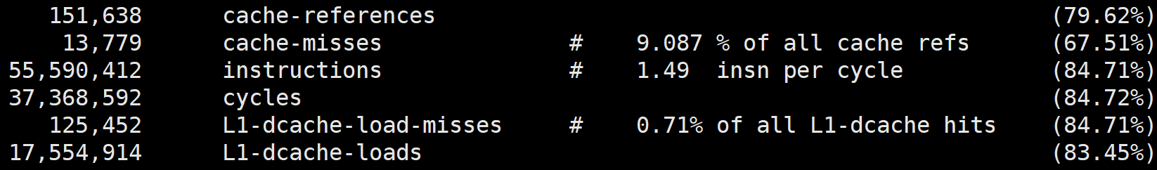 如果你在用Linux操作系统,可以通过一个名叫Perf的工具直观地验证缓存命中的情况(可以用yum install perf或者apt-get install perf安装这个工具,这个网址中有大量案例可供参考)。
