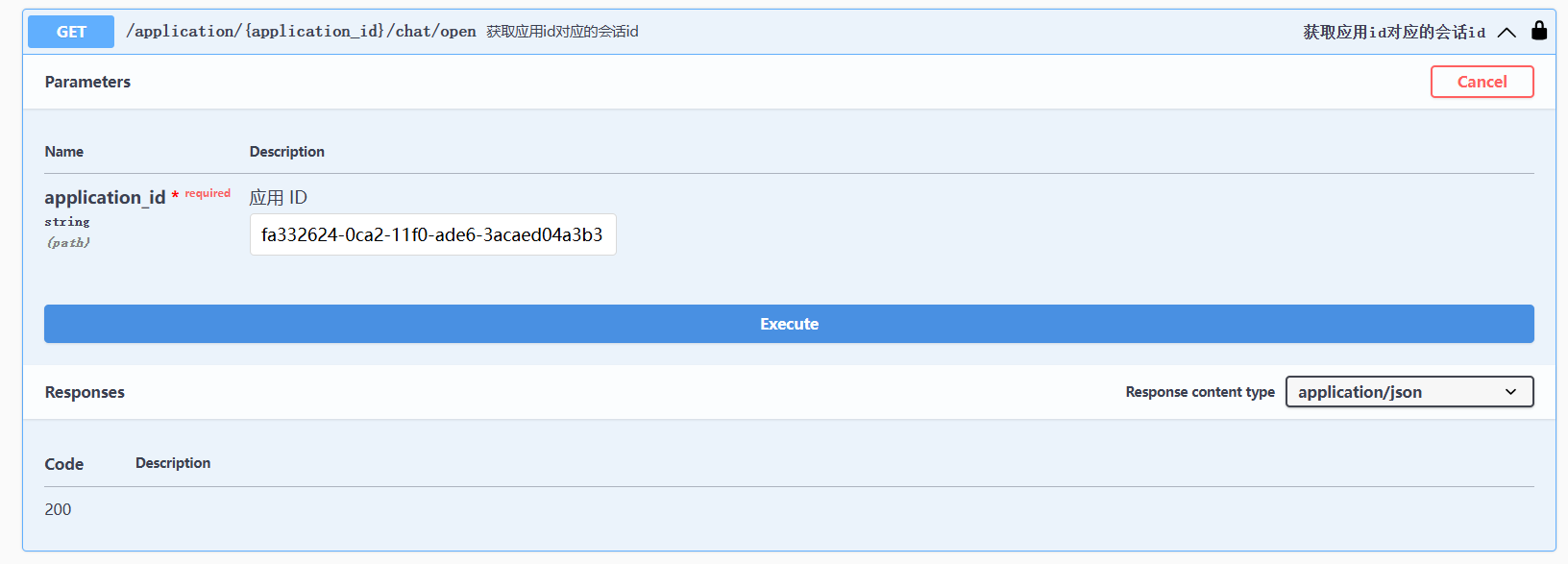 我们需要其中的 id 的值。接着,点击第三条 API 的 Try it out,将 id 填到 application id 那里,然后点击 Execute并执行。