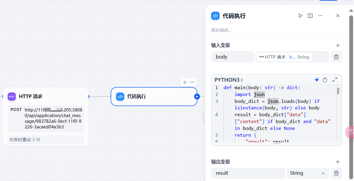 代码解释器的主要功能是解析 HTTP 请求模块的输出 body,从中将 content 的值拿出来。因此我编写的代码如下: