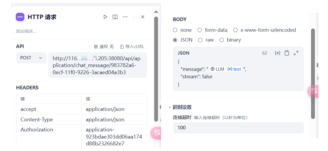 在 Body 中,我们设置为 JSON 格式,然后将 LLM 的输出 text 作为 message 的入参。