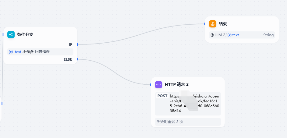 我这样做的目的是,当 LLM2 认为前面的节点算对了的时候,就直接将内容输出,结束就可以了。但如果算错了,就可以将 LLM2 结果返回的同时,将结果再通过飞书或者其他方式通知给人类,让人类判断一下是否要人工看看答案算对了没。当然这一步不通知也无所谓,毕竟我们还是要相信第二个模型的纠错能力。
