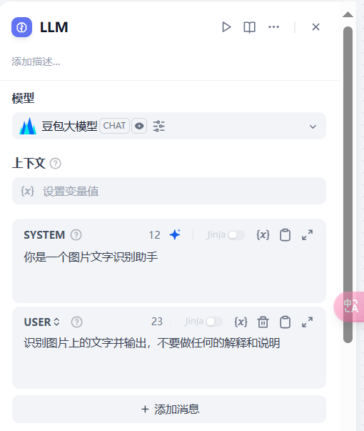 接下来,我们开始编辑 Dify 节点。首先将 LLM 节点再改回到图片识别的 prompt。