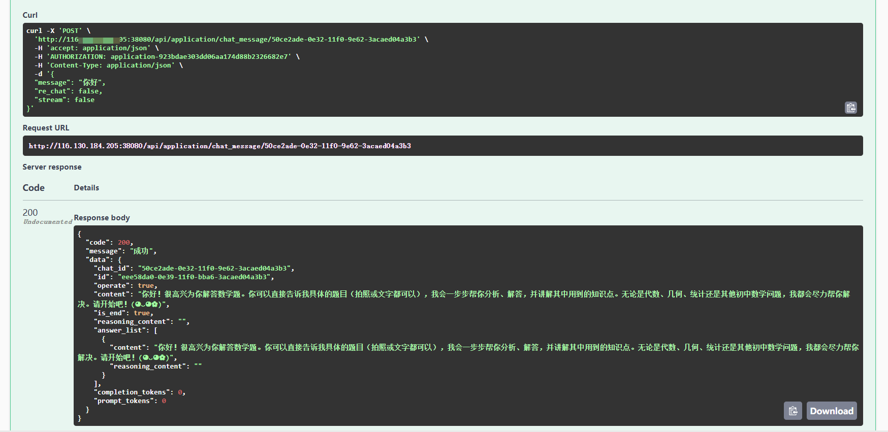 我们顺便将对话 API 也测试了,这样能摸清楚它的返回值的格式。