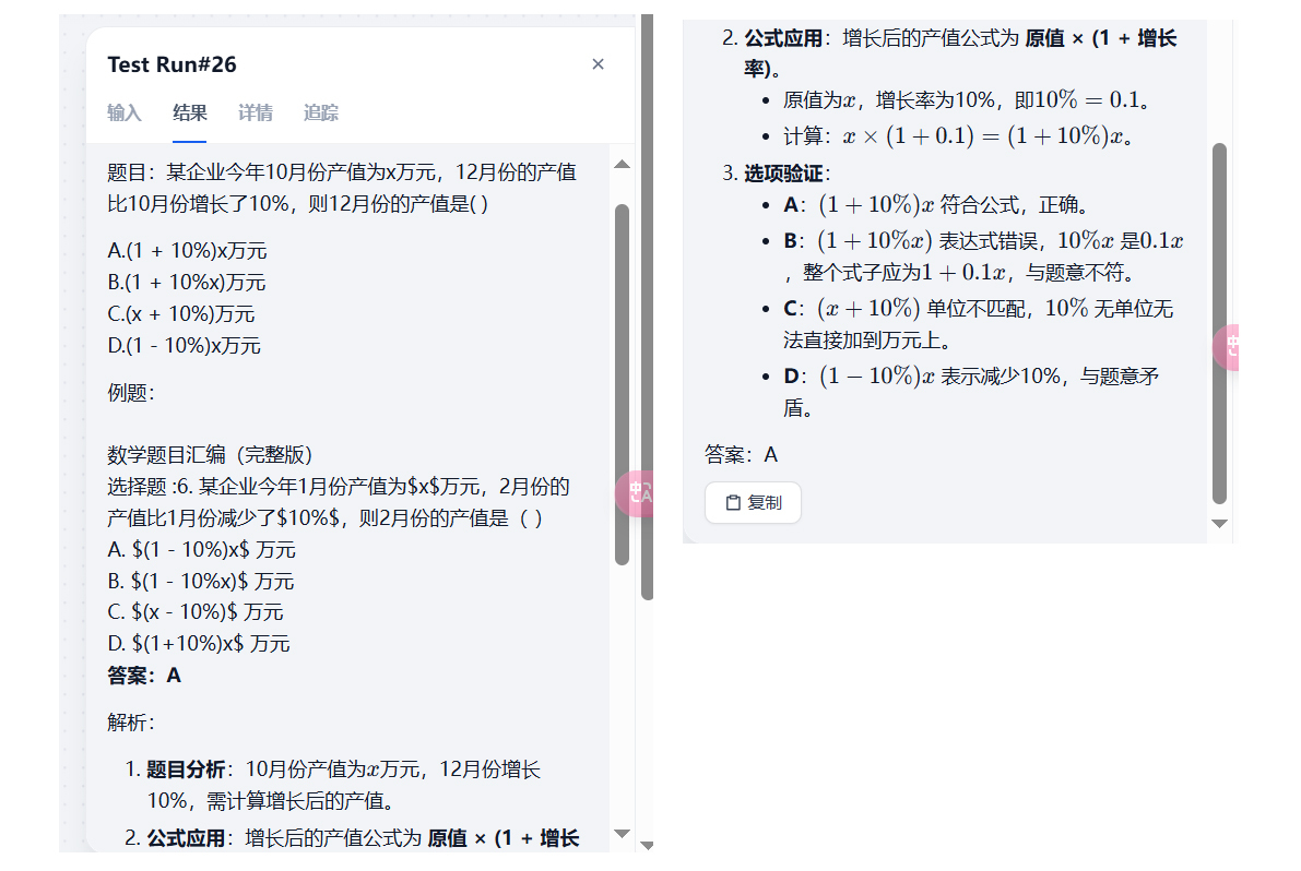 它的效果就是,当我们问到题库中类似的题目时,由于题库的题目是有题干、也有答案的,因此相当于给了大模型一个例题,大模型可以根据例题来解决新的问题,从而提升问题解答的准确率。