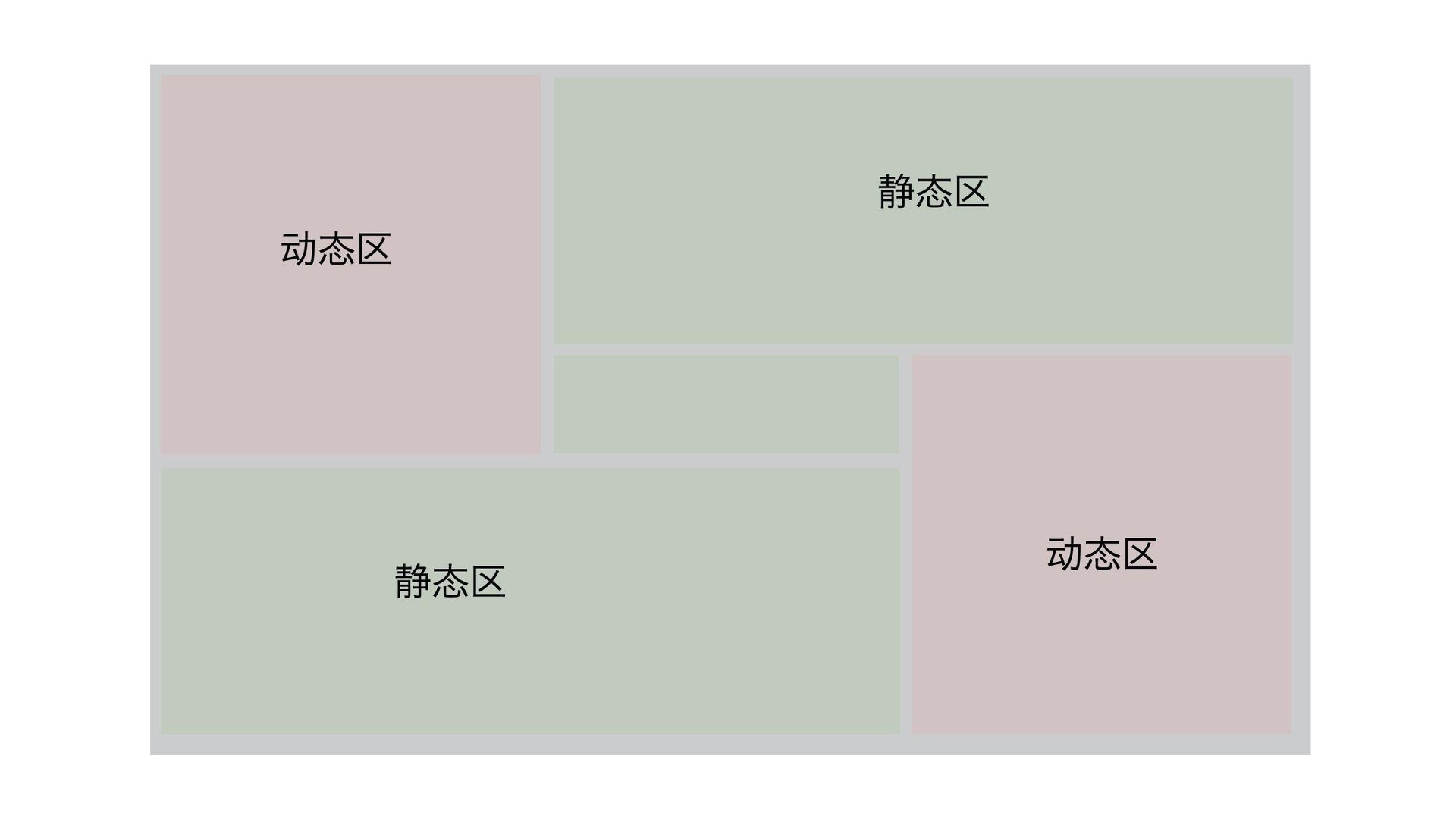 但是,我们用分层渲染解决性能问题的时候,所绘制的图形必须满足两个条件:一是有大量静态的图形元素不需要重新绘制,二是动态和静态图形元素绘制顺序是固定的,先绘制完静态元素再绘制动态元素。如果元素都有可能运动,或者动态元素和静态元素的绘制顺序是交错的,比如先绘制几个静态元素,再绘制几个动态元素,然后再绘制静态元素,这样交替进行,那么分层渲染就不好实现了。这时候,我们还有另外一种优化手段,它叫做局部重绘。