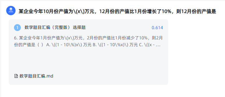 接下来就是将文档导入到知识库了,我准备的是一份中学数学题试卷。不过在导入之前,我们需要对文档的格式、内容排版等做手工调整,这样才能增加向量搜索时的命中率,这个步骤称之为数据清洗。