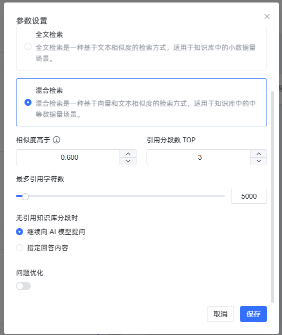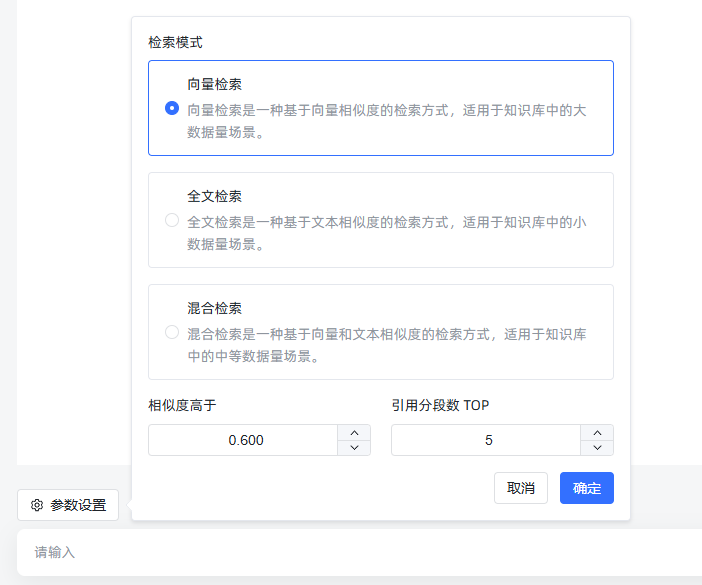 点击命中测试的参数设置后,可以看到有三种检索模式。分别是向量检索,全文检索以及混合检索。这里我为你简单做一下解释。