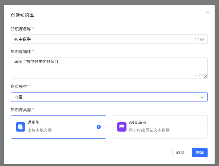 数据清洗完毕后,我们就可以建立知识库,并导入文档了。点击创建知识库,填入名称、描述、向量模型等信息,之后点击创建。
