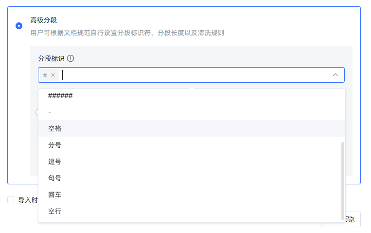 我们可以看到,其实分得并不理想。我们期待的效果是每一道题分一段,这样会匹配的非常准确,但现实是多道选择题挤到了一段里。这时我们就可以点击高级分段,看看能不能自己调整一下分段规则,达成想要的效果。