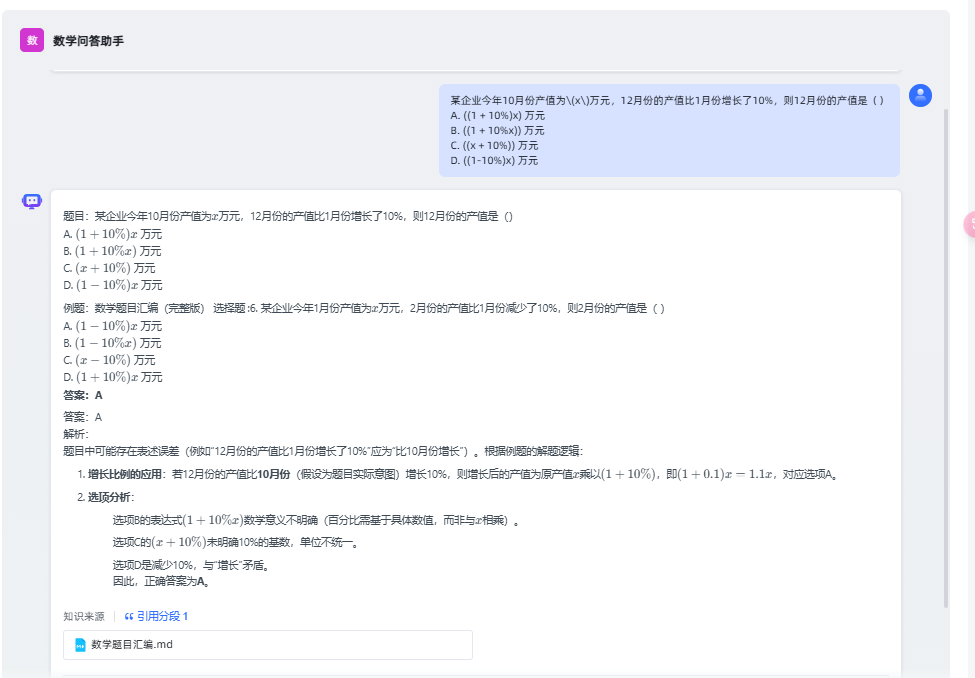 可以看到是引用了一个分段的,这就说明 RAG 过程成功了。这里同时还说明了大模型具备举一反三的能力,通过一个例题,解答了新的题目。