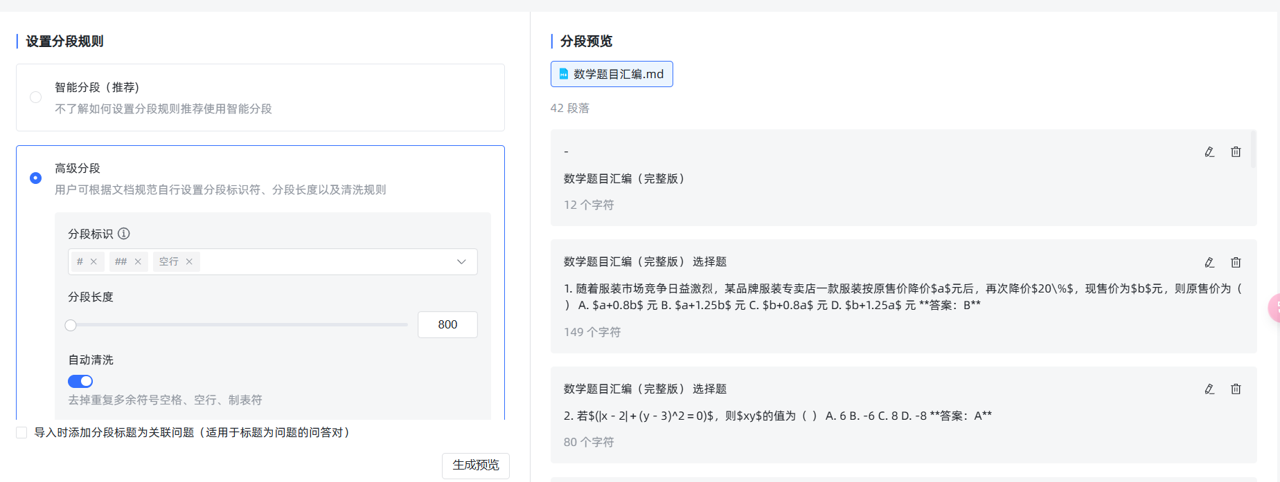 然后我们再次导入,选择高级分段,分段表示选择“#”“##”。空行表示按 MardDown 的一级、二级标题和空行分段,把分段长度调整成 800,防止 35 题之后的那些计算题由于太长而被拆分了。再次生成预览,可以看到这次效果达标了。