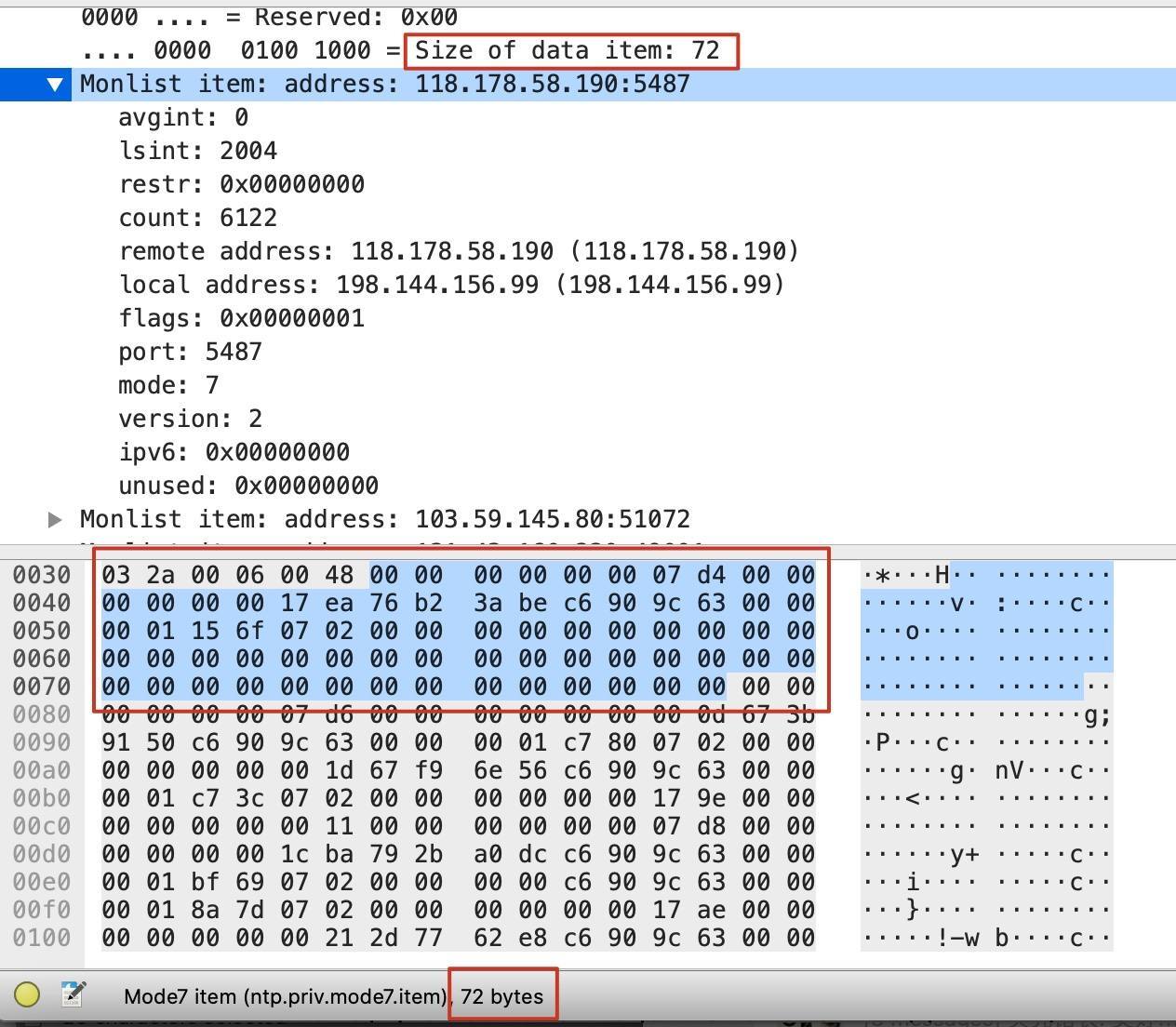 响应包按照每6个IP进行分割,最多有100个响应包。这样的话,一个简单的NTP Monlist响应,就可能是请求的200多倍。想象一下,如果请求是1Gbps,那这次反射攻击就可以达到200Gbps以上,实在惊人!