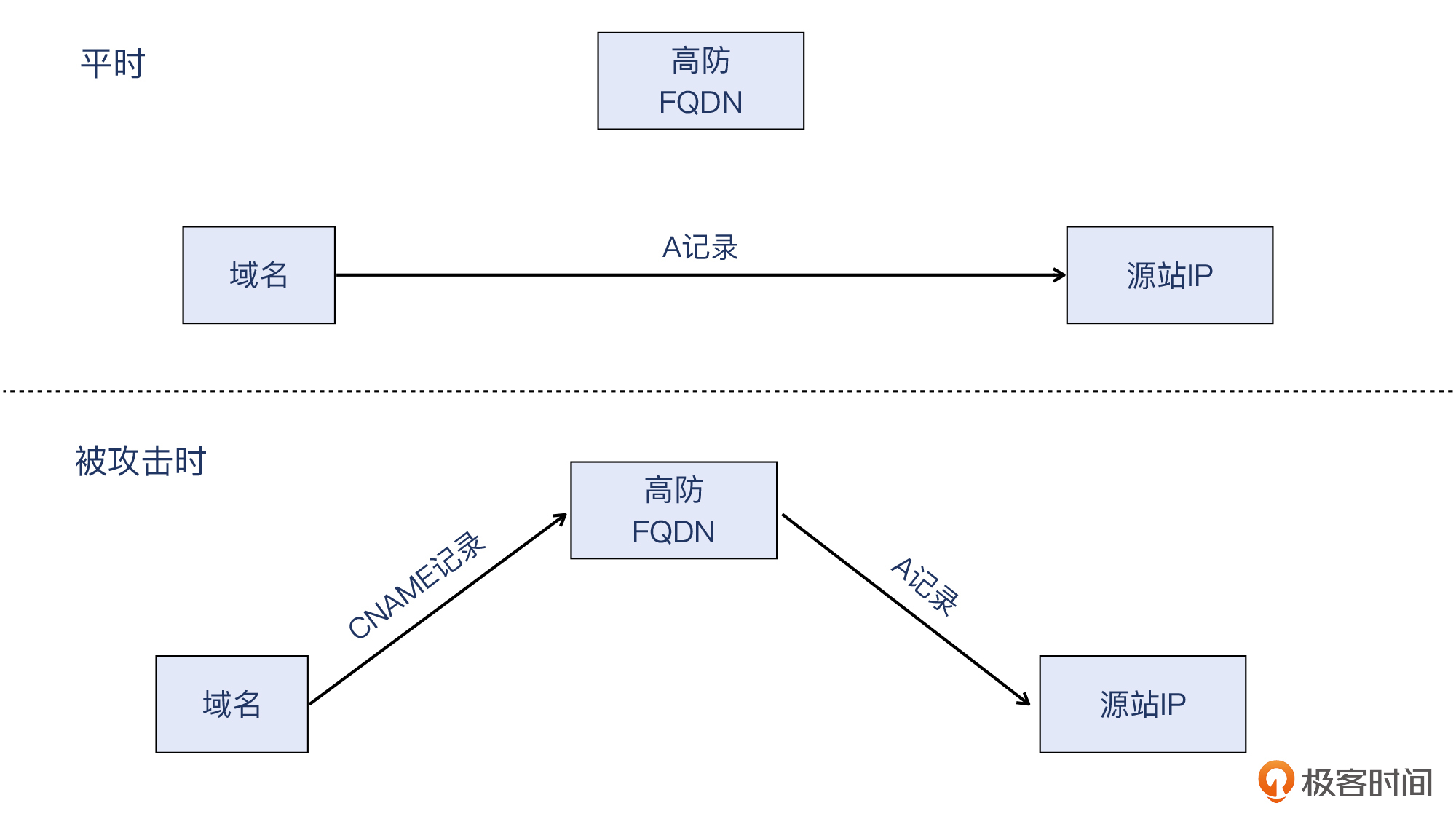 由于高防按时计费而且费用高昂,一般平时是不接入高防的。只有探测到被攻击时,才自动或者手动转入高防。这里的“接入高防”是什么意思呢?其实就是把站点域名指向高防的域名,这样就把流量先流向高防,再经清洗后回到源站。