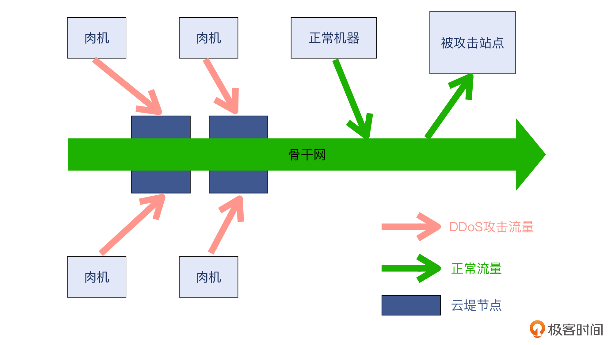 你有没有发现,从防护的生效点来说,高防这种方式是作用在服务端这一侧。那你可能会想到:如果我们能在攻击的源头就做防护,那是不是效果会更好呢?这就是另一类DDoS防护产品的设计思想,其中比较典型的产品是电信云堤。