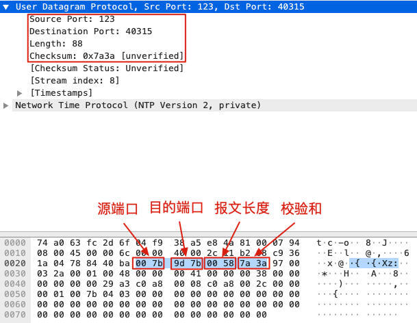 由上图可见,UDP头部其实只有8个字节,分别是: