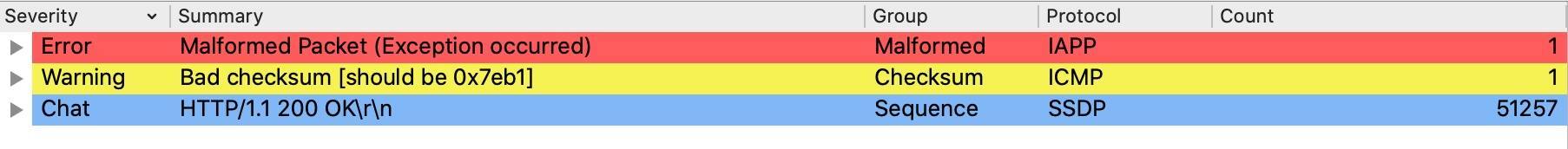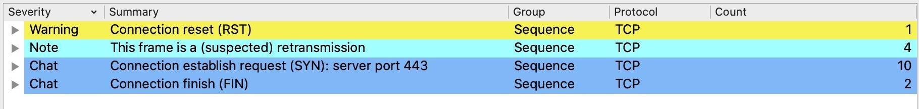 从抓包文件概览来看,确实是不正常。按惯例,我们看一下Expert Information: