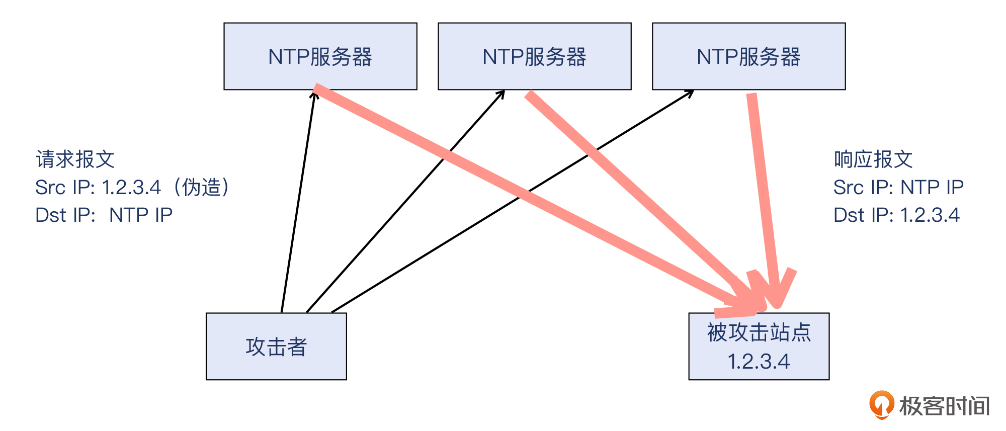其实,这正是前面说的1Gbps能放大为200多Gbps的原因。它的背后,就是反射攻击的核心技巧:它利用IP协议“不对源IP做验证”的不足,构造一个IP报文,其源IP为被攻击站点的IP,使得NTP服务器回复的报文也被发往被攻击站点。大量的响应报文就被引到了被攻击站点这里。而且这个过程中,NTP服务器被利用了还不知道。我们看个示意图: