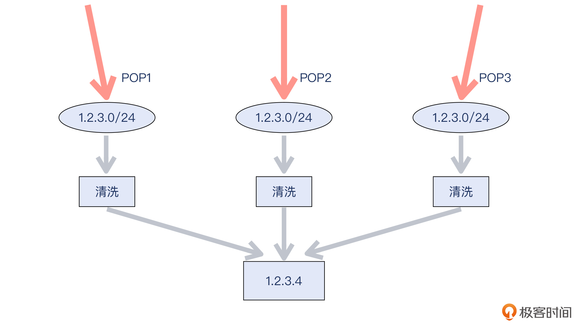 比较大型的网站都会在各地部署POP点(也就是多POP),然后这些POP点会宣告相同的IP段。一旦有DDoS攻击,因为它的目标IP是属于anycast网段的,所以会被因特网的路由策略,相对均匀地分布到这些POP。