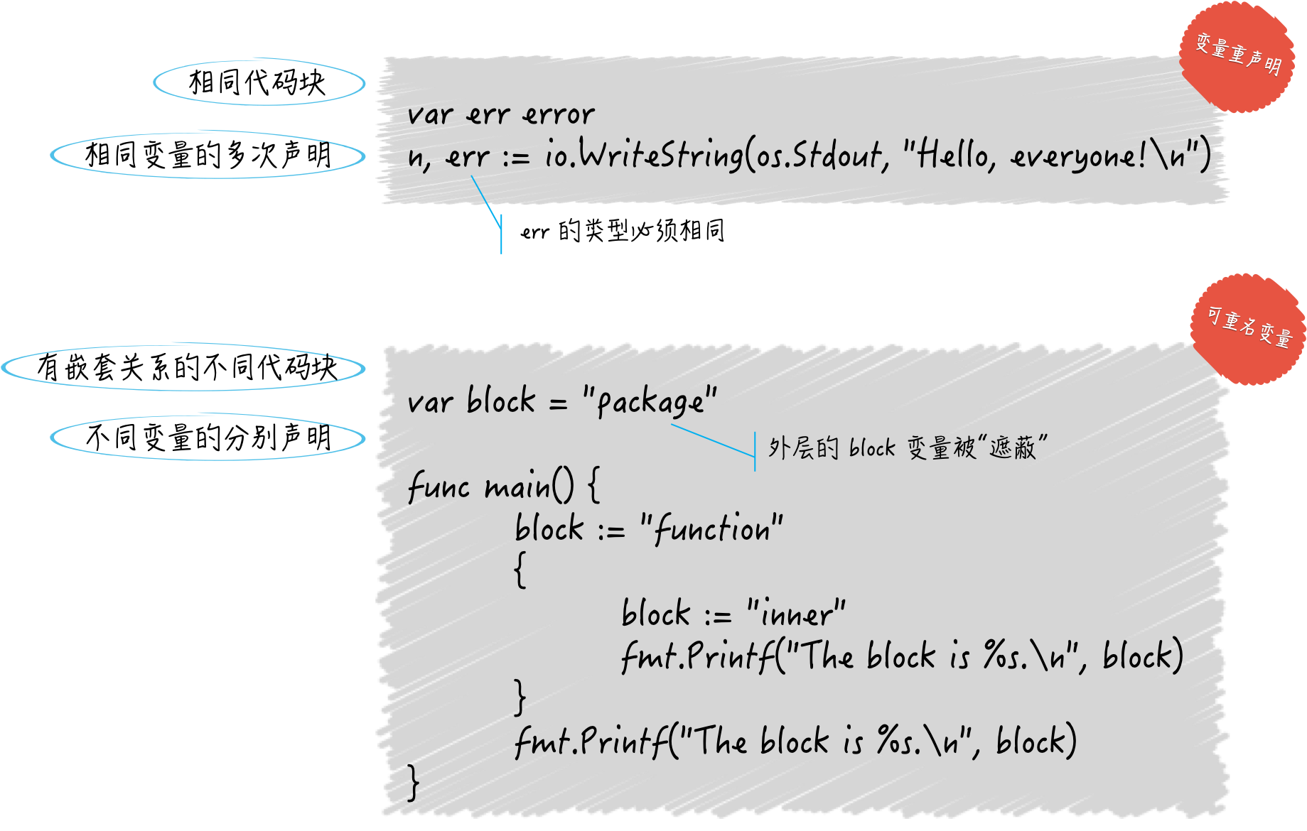 初看这道题,你可能会认为它无法通过编译,因为三处代码都声明了相同名称的变量。的确,声明重名的变量是无法通过编译的,用短变量声明对已有变量进行重声明除外,但这只是对于同一个代码块而言的。