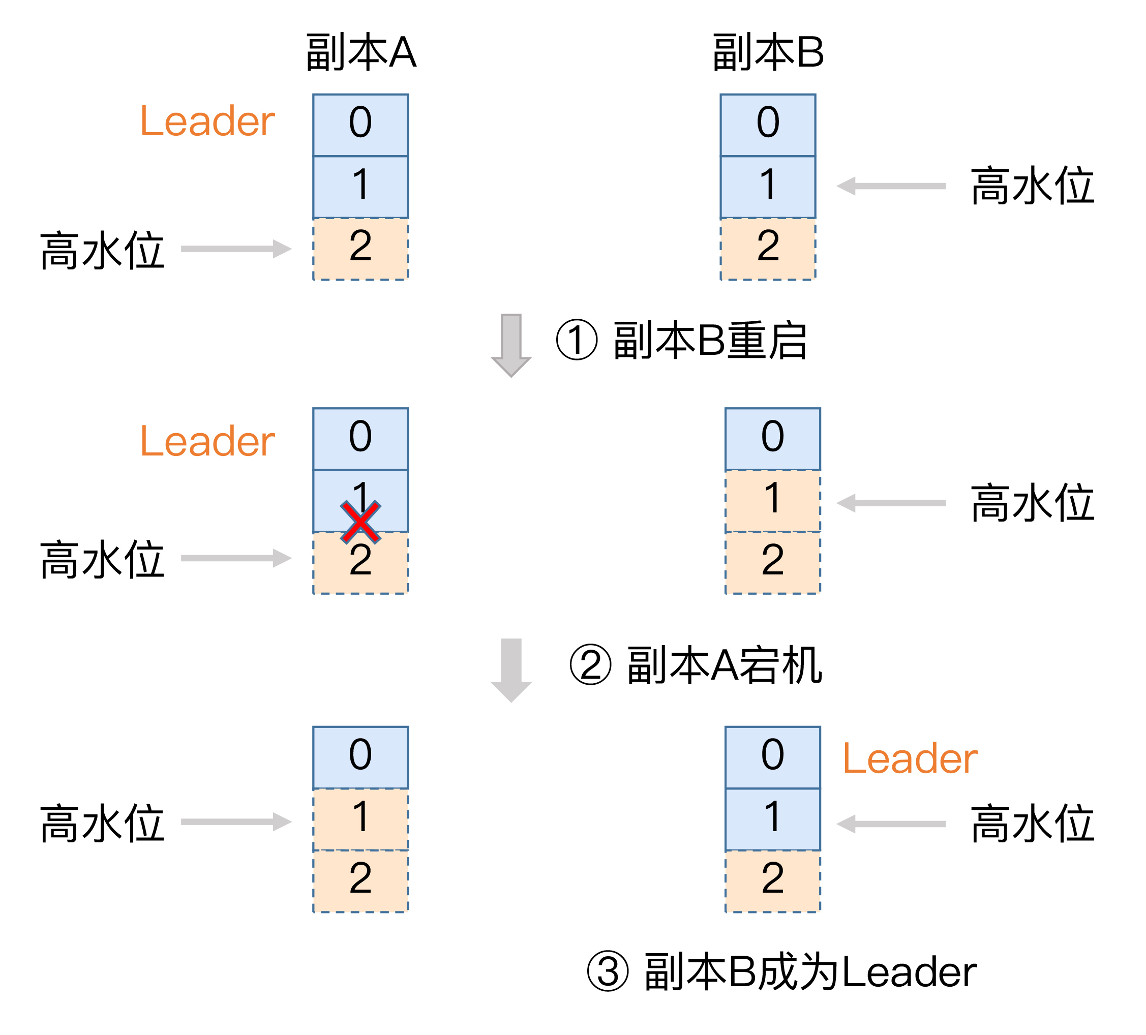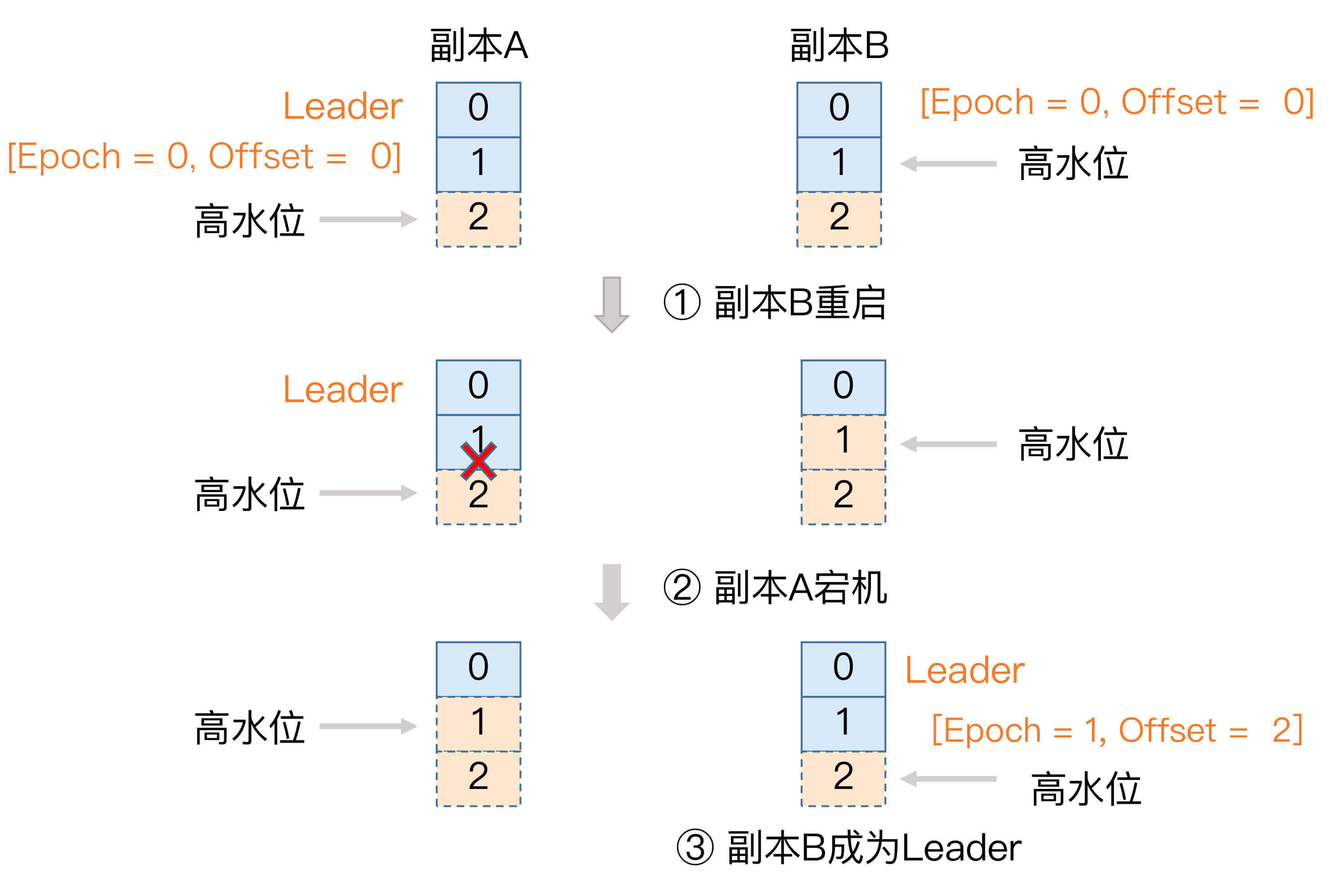 现在,我们来看下如何利用Leader Epoch机制来规避这种数据丢失。我依然用图的方式来说明。