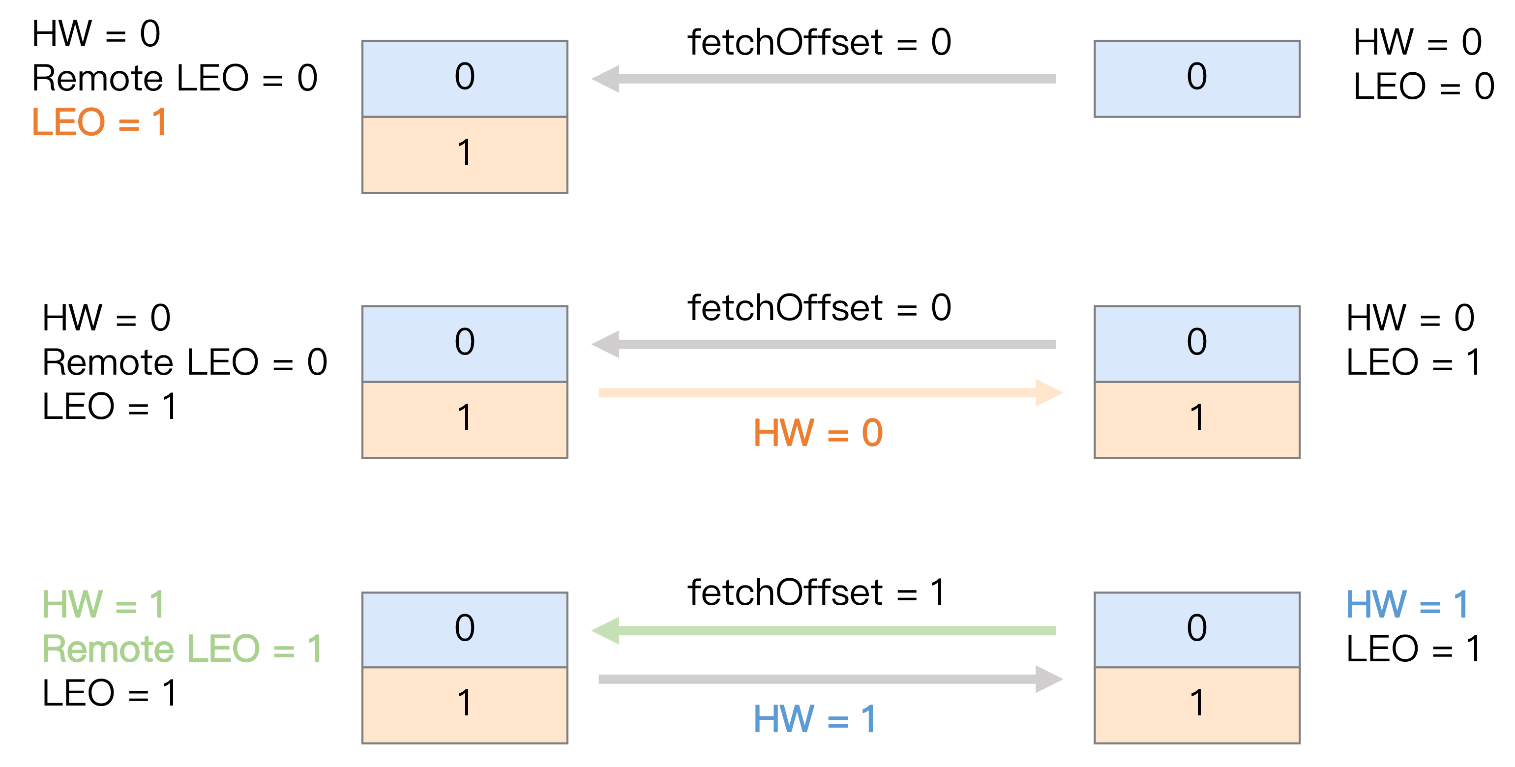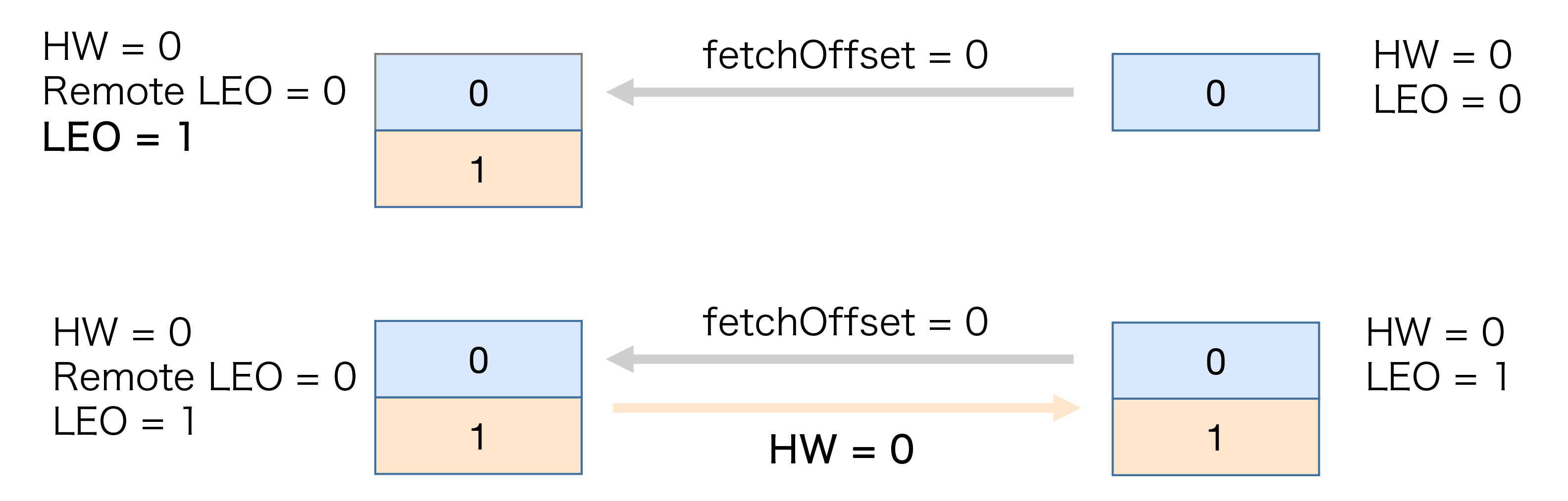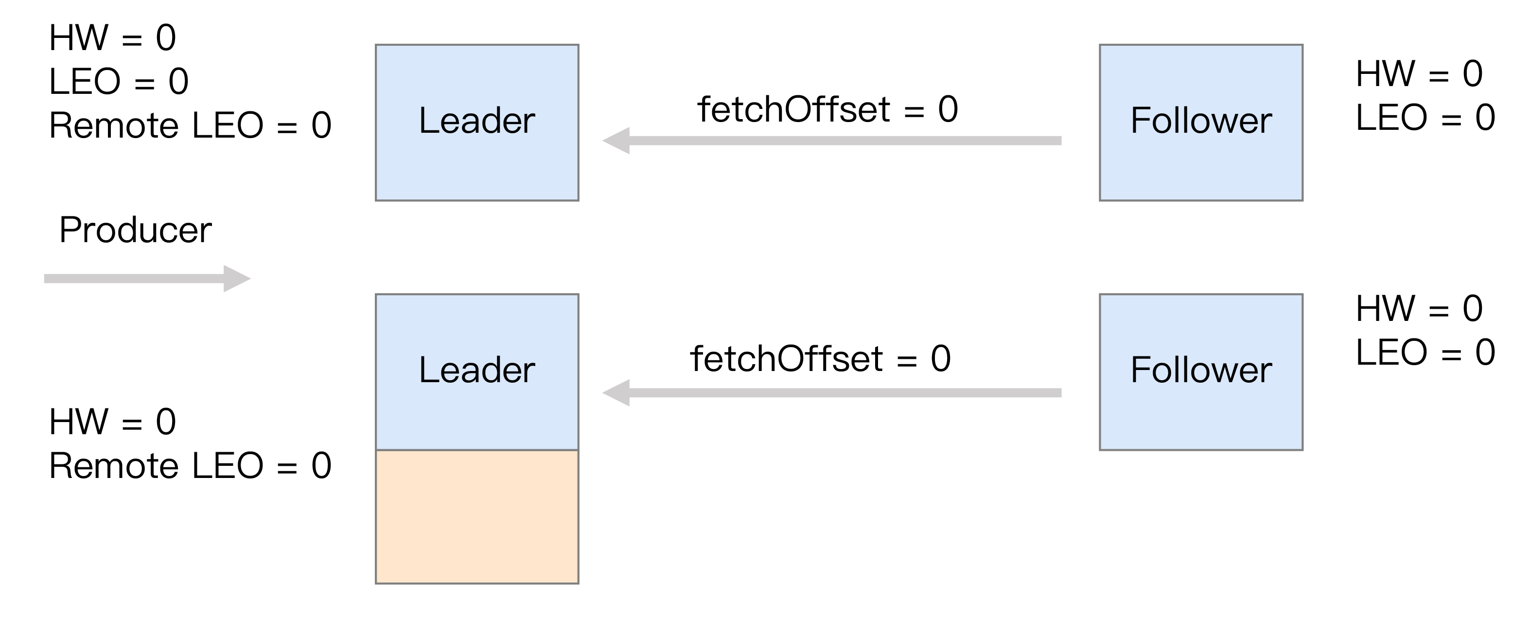 首先是初始状态。下面这张图中的remote LEO就是刚才的远程副本的LEO值。在初始状态时,所有值都是0。