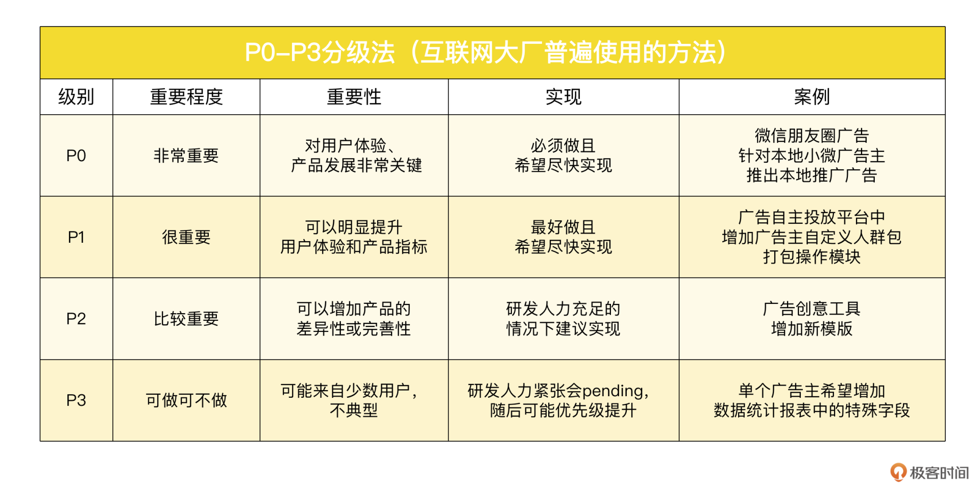 举个例子,微信朋友圈广告针对本地小微广告主(比如非连锁的奶茶店、洗衣店等)推出本地推广广告,允许这些小微广告主以几千元的价格购买,在其所在商圈方圆几公里内的地域定向广告,就属于一个P0级别的需求。该本地推广产品上线之后,在各地渠道代理商和小微广告主那里引起了强烈的反响,也为微信朋友圈广告流量的精细化运营作出了显著贡献。