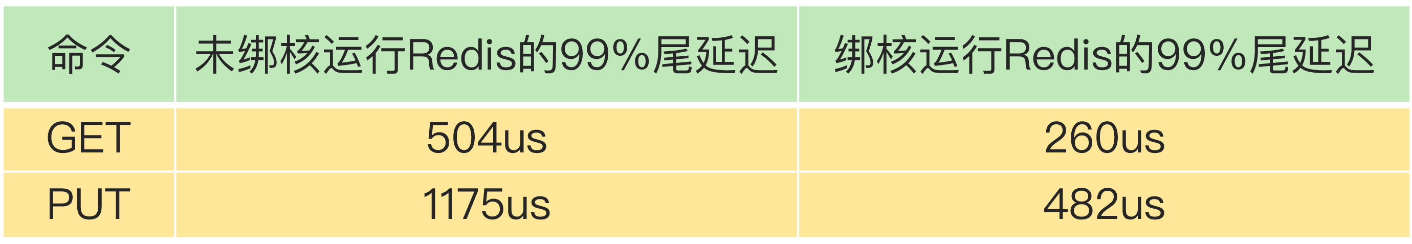 绑定以后,我们进行了测试。我们发现,Redis实例的GET和PUT的99%尾延迟一下子就分别降到了260微秒和482微秒,达到了我们期望的目标。