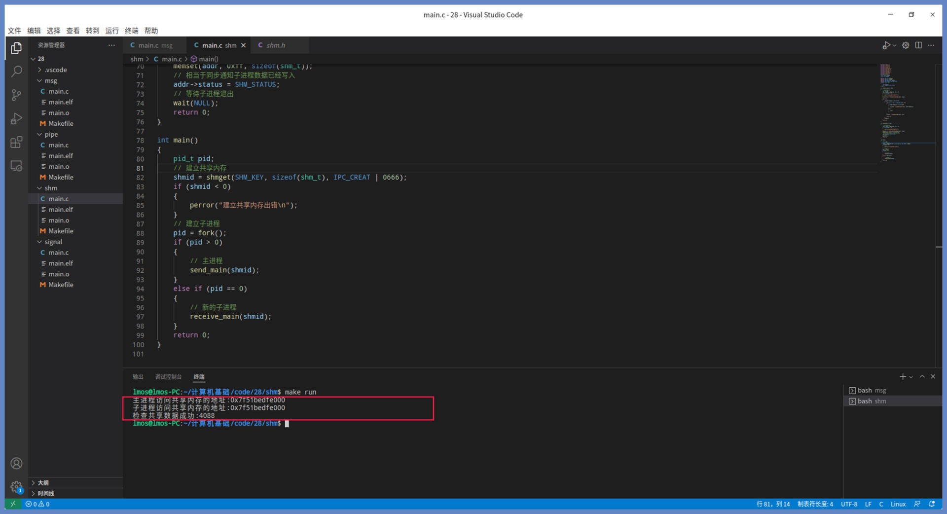 对照代码可以看到,两个函数都是调用shmat函数,它们为各自进程绑定了一个虚拟内存地址,并基于该地址访问共享内存。