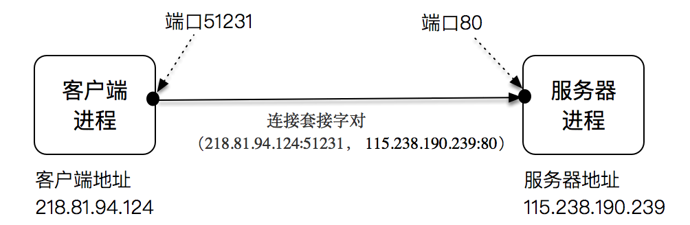 一个连接可以通过客户端-服务器端的IP和端口唯一确定,这叫做套接字对,按照下面的四元组表示: