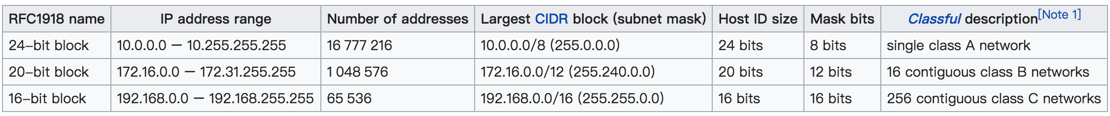 如果你很幸运地可以拥有IPv4地址的第1个字节⽹络,另外3个字节表示主机地址,那在你的⽹络⾥,你有价值3个字节,也就是24个⽐特的主机地址,这是什么概念呢? 2 的 24 次⽅,⼤约是⼀千六百万个地址左右(图中Number of addresses)。这是⼀个“Class A”(A 类)⽹络。