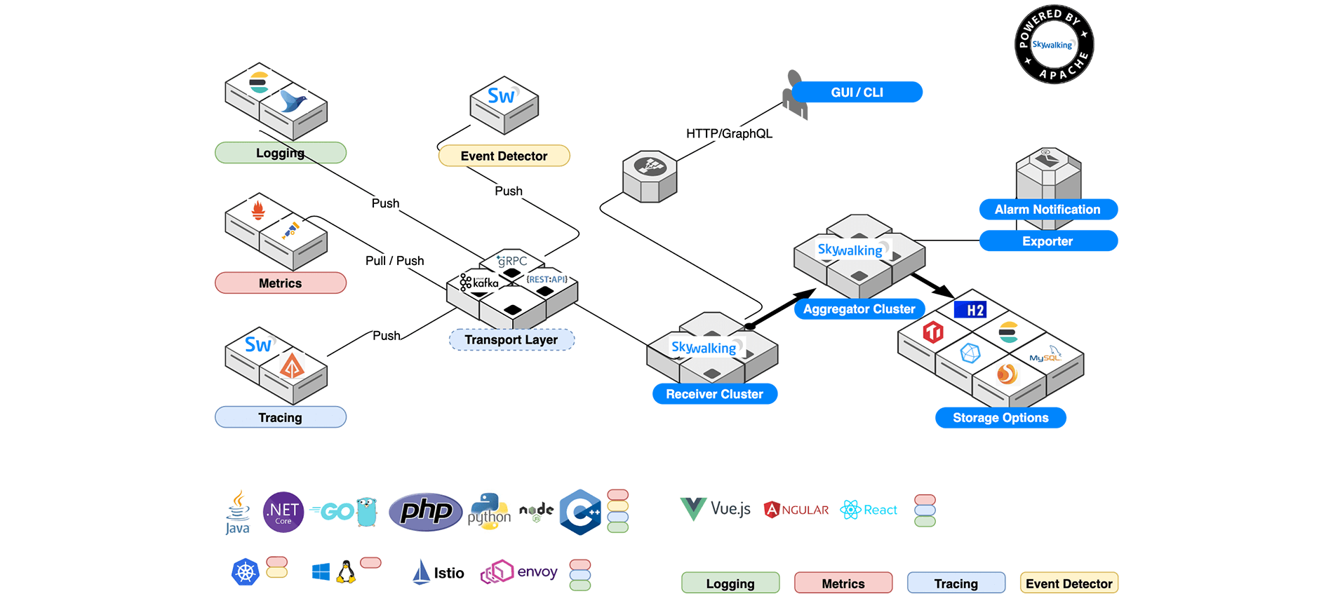 Apache SkyWalking是一款专门为云原生和基于容器架构设计的应用性能监控工具。它提供了实时应用拓扑分析、应用性能指标监控、调用链路追踪、慢服务检测、性能优化建议等功能。你可以通过官方提供的架构图了解SkyWalking的整个原理。