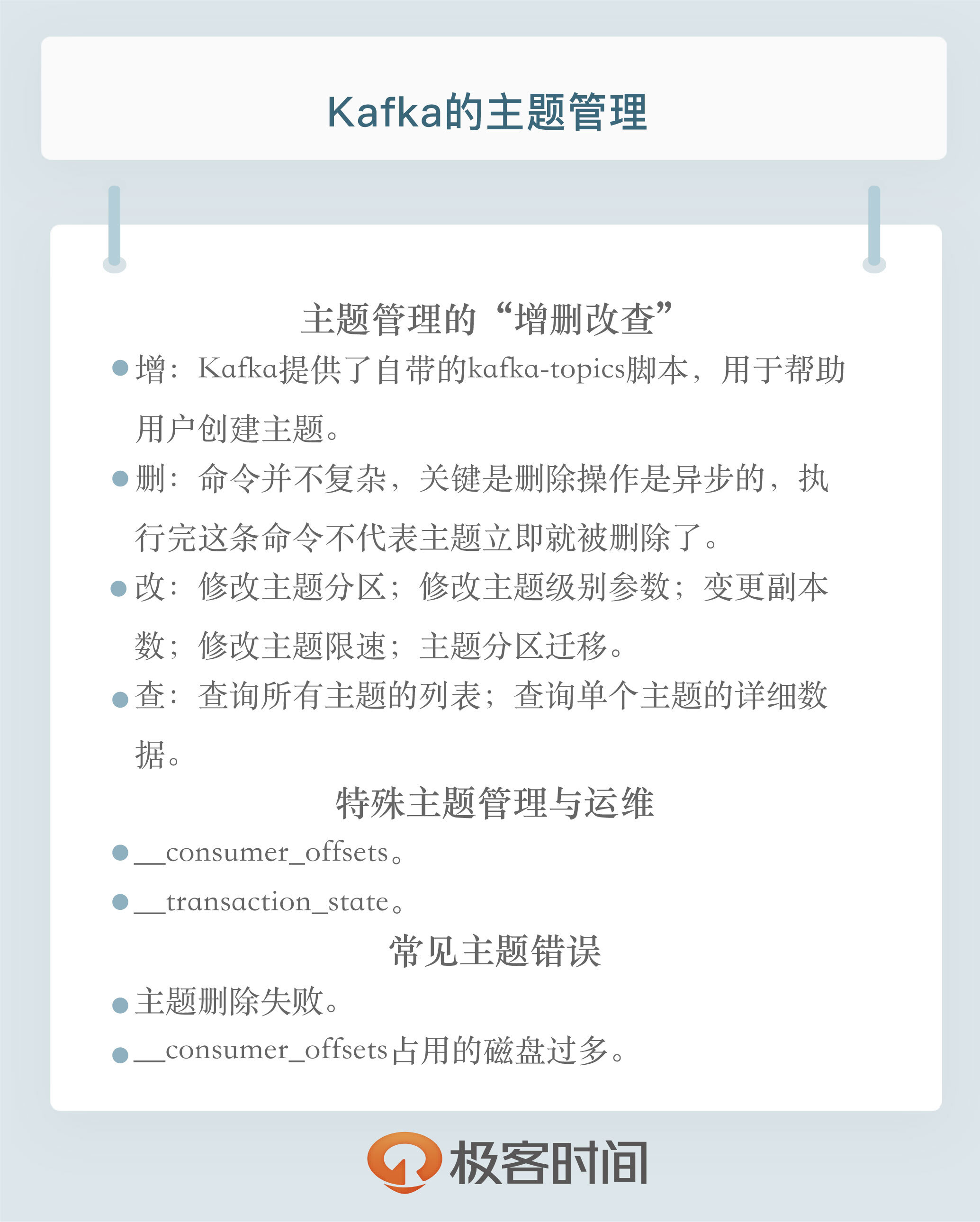 我们来小结一下。今天我们着重讨论了Kafka的主题管理,包括日常的运维操作,以及如何对Kafka内部主题进行相应的管理。最后,我给出了两个最常见问题的解决思路。这里面涉及到了大量的命令,希望你能够在自己的环境中对照着实现一遍。另外,我也鼓励你去学习这些命令的其他用法,这会极大地丰富你的Kafka工具库。