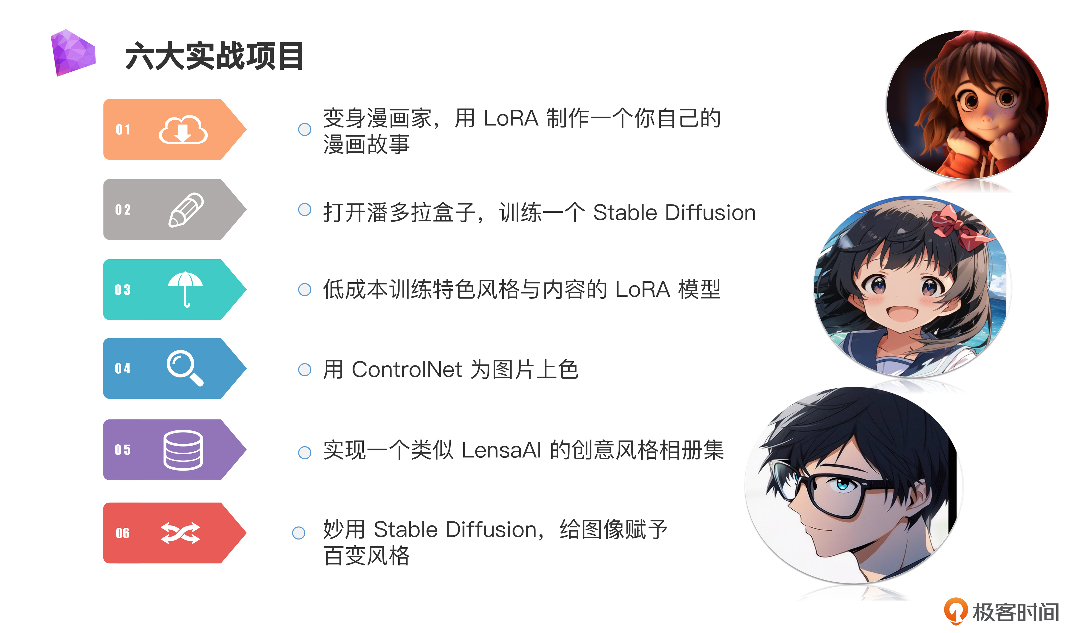 我们将一起完成DreamBooth、LoRA模型的训练,使用ControlNet精细化控制内容的生成,做出类似于LensaAI这样的相册类效果,借助Stable Diffusion给你的照片渲染出各色风格。经过这些实战课的洗礼,相信你对AI绘画的应用能力会得到质的飞跃。