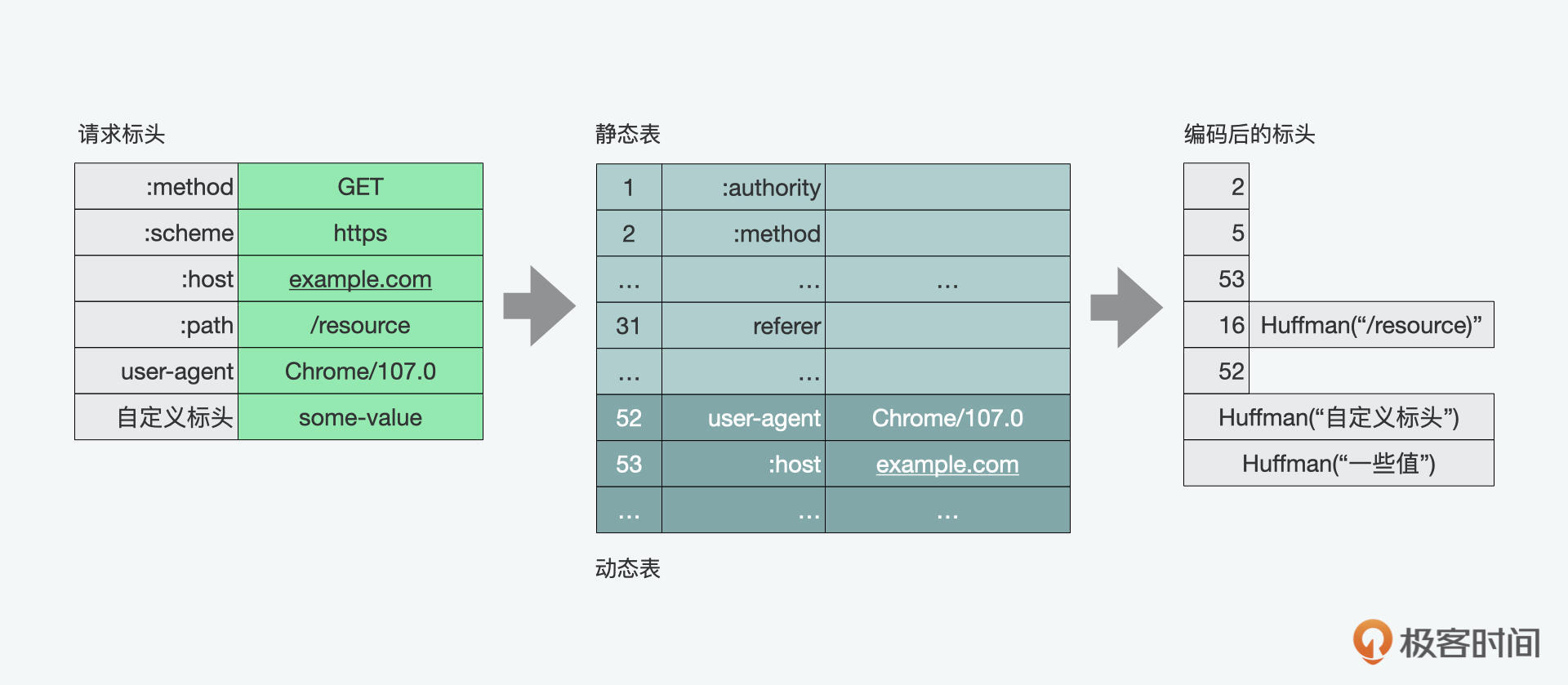 HPACK有静态和动态两个表。静态的是一些常用的标头元素;动态表开始是空的,后面根据实际的请求来增加。如果想更深入理解霍夫曼算法的同学,也可以参考隔壁班黄清昊老师算法课中的[《哈夫曼树:HTTP2.0是如何更快传输协议头的?》]。