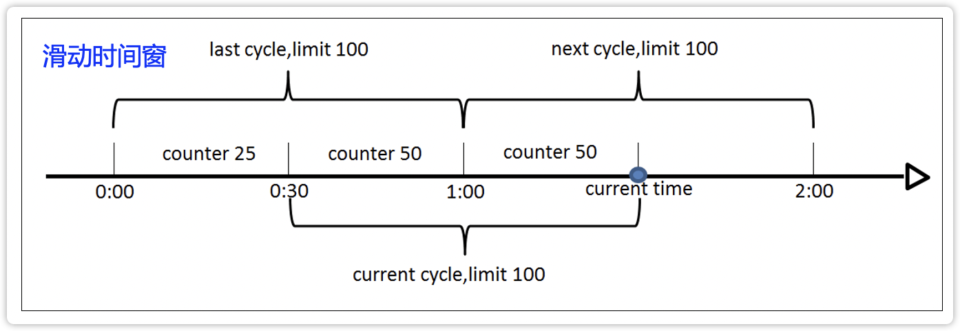 为了解决临界点问题,滑动时间窗算法应运而生,它的实现原理是,两个统计周期部分重叠,从而避免短时间内的两个统计点分属不同的时间窗的情况,如下图所示:
