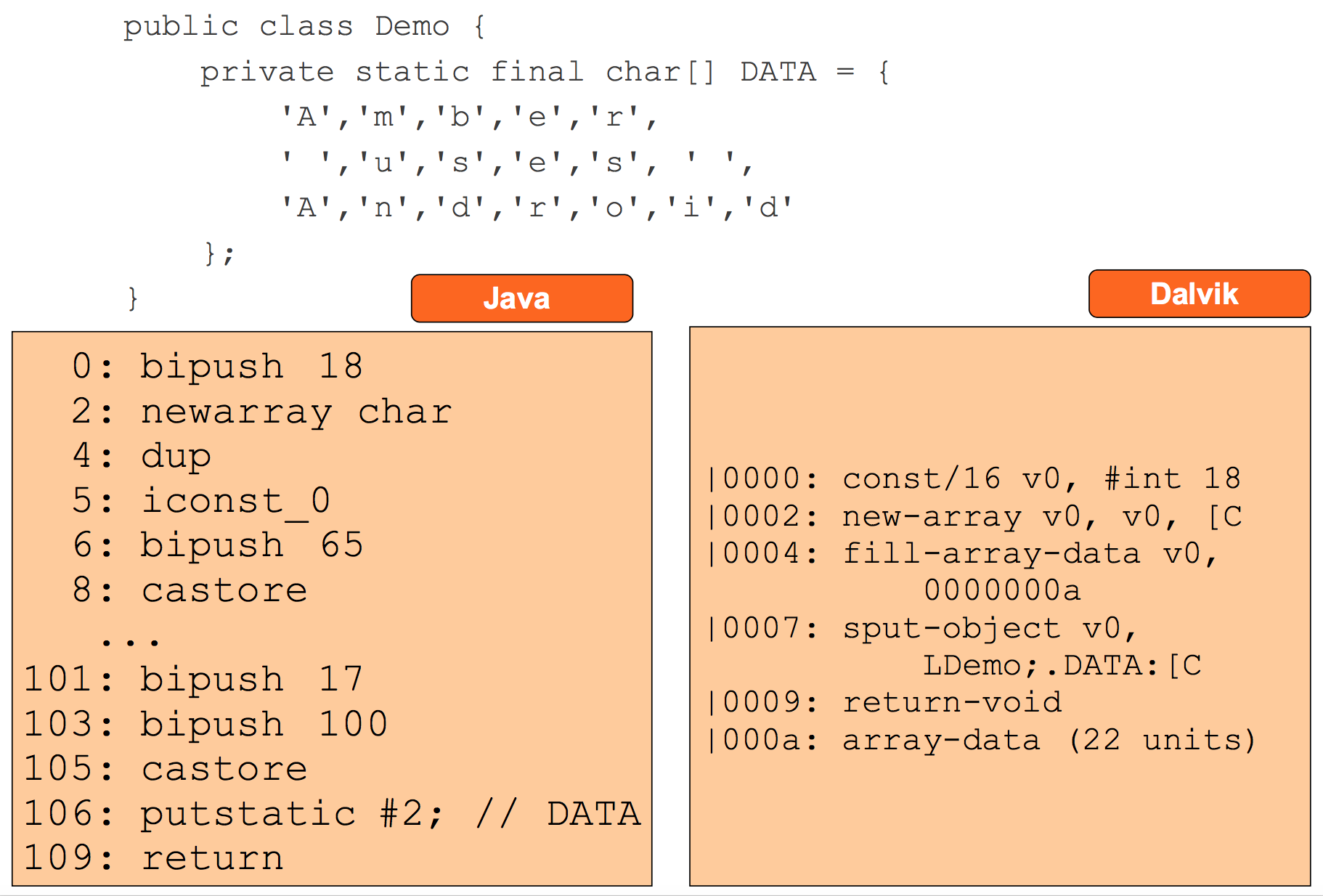 - 指令优化。Dalvik字节码对大量的指令专门做了精简和优化,如下图所示,相同的代码Java字节码需要100多条,而Dalvik字节码只需要几条。