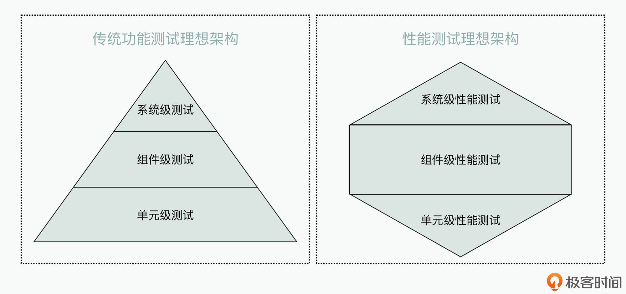 而性能测试的理想架构如图的右侧所示,我认为应该由少量的系统级性能测试和单元模块级别的性能测试,与尽量多的组件或服务级的性能测试组成。