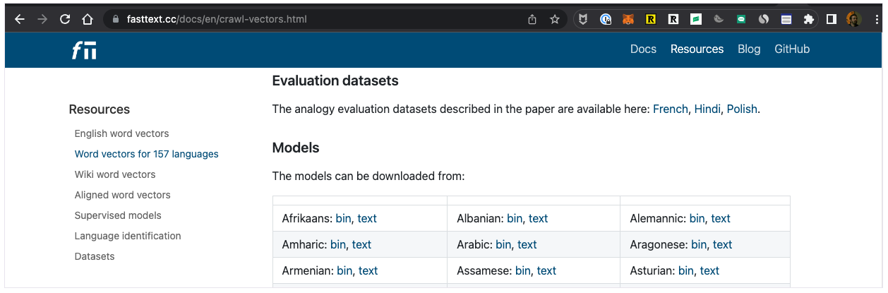 然后,我们要把Fasttext对应的模型下载到本地。因为这些开源库和对应的论文都是Facebook和Google这样的海外公司发布的,效果自然是在英语上比较好,所以我们就下载对应的英语模型,名字叫做 “cc.en.300.bin”。同样的,对应模型的下载链接,我也放在这里了。