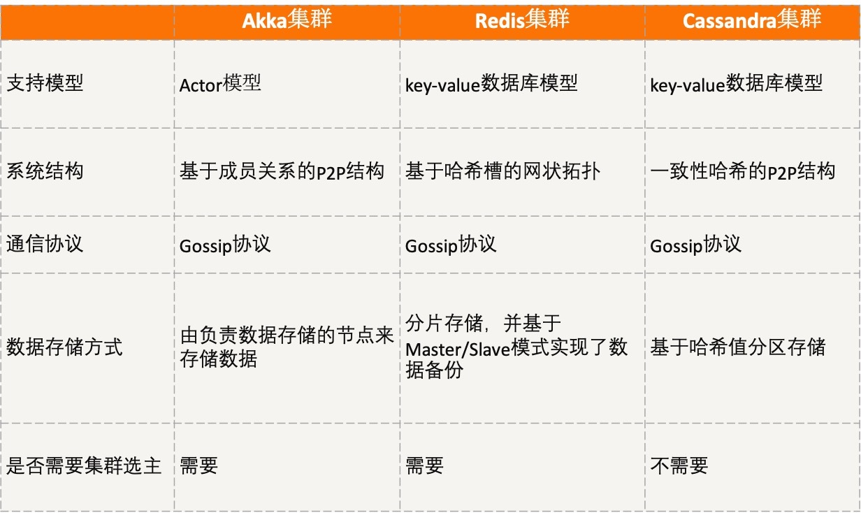 好了,以上就是Akka集群、Redis集群和Cassandra集群的主要内容了。为了便于理解与记忆,我将这3个集群的主要特征梳理为了一张表格,如下所示: